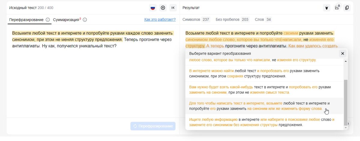 ⚡️Стоит ли использовать синонимайзер и что за это будет? Я за использование различных сервисов, упрощающие работу, но синонимайзеры в этот список не входят. Хотя многие мои ученики так и лезут в это болото, ухудшая себе жизнь. Всё же хотите попробовать? Попробуйте прогнать любой текст в https://rustxt.ru/synonymizer или https://online-sinonim.ru/. Ну как, впечатляет результат? Похоже на перевод Алиэкспресса. Уникальным полученный текст также не является, потому что вы не можете заменить каждое слово в тексте — на многие попросту нет подходящих по контексту синонимов. Даже если в каком-то тексте у вас это получится — вы всё равно не изменили структуру предложений. Это антиплагиаты уже давно научились считывать за секунды. В рекламе платных синонимайзеров вы увидите кучу обещаний, что это самая лучшая программа, уникальная в своем роде и что только она способна сделать из текста конфетку. У меня есть отличное доказательство того, что это не работает. Возьмите любой текст в интернете и