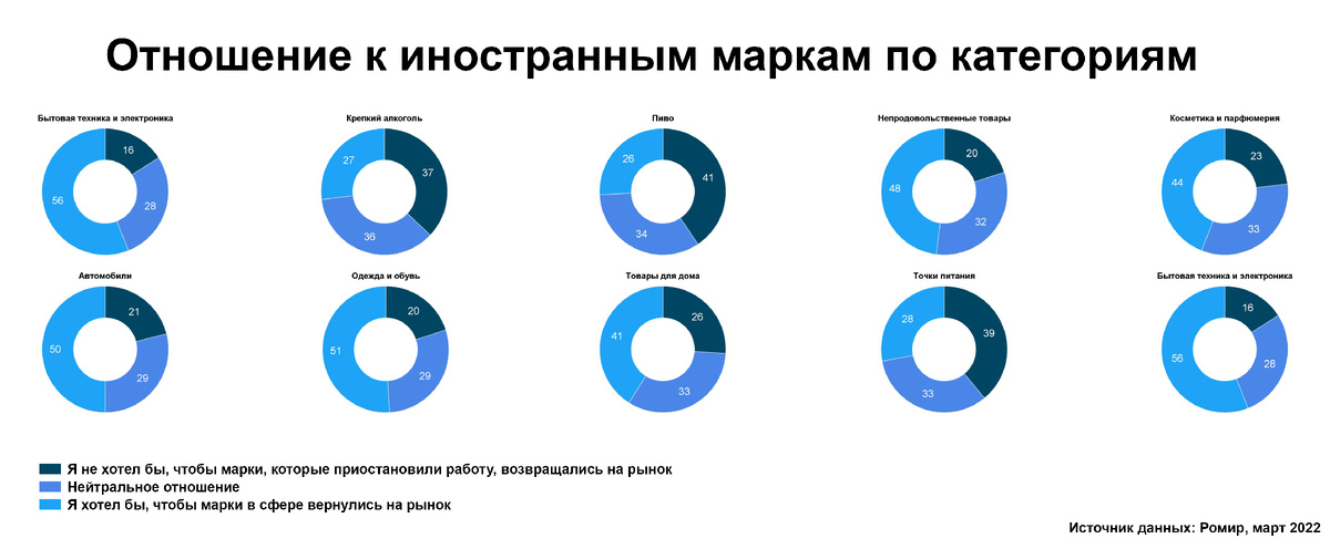 #Ангелы_исследования Ни для кого не секрет, что многие иностранные компании покинули российский рынок. Но по каким брендам россияне ностальгируют больше всего, а чьё возвращение и вовсе не волнует граждан? Команда «Ангелов Маркетинга» знает ответ на этот вопрос. 1. Больше всего ждут возвращения брендов бытовой техники (56%), одежды и обуви (51%), а также автопроизводителей (50%). Так же россияне скучают по иностранным непродовольственным товарам (48%), косметике и парфюмерии (44%) и товарам для дома (41%). 2.Нейтральную позицию большинство опрашиваемых выразили по поводу категории «Продукты питания» (37%). 3. Что же касается категорий товаров, которые не будут овациями приняты назад, здесь, как ни странно, представлены иностранные производители пива (41%) и крепкого алкоголя (37%). Более того, негативно россияне реагируют и на возможность возвращения точек общественного питания (39%) Конечно, каждый относится к данной теме по-разному. И вы можете не согласиться с данными результатами.