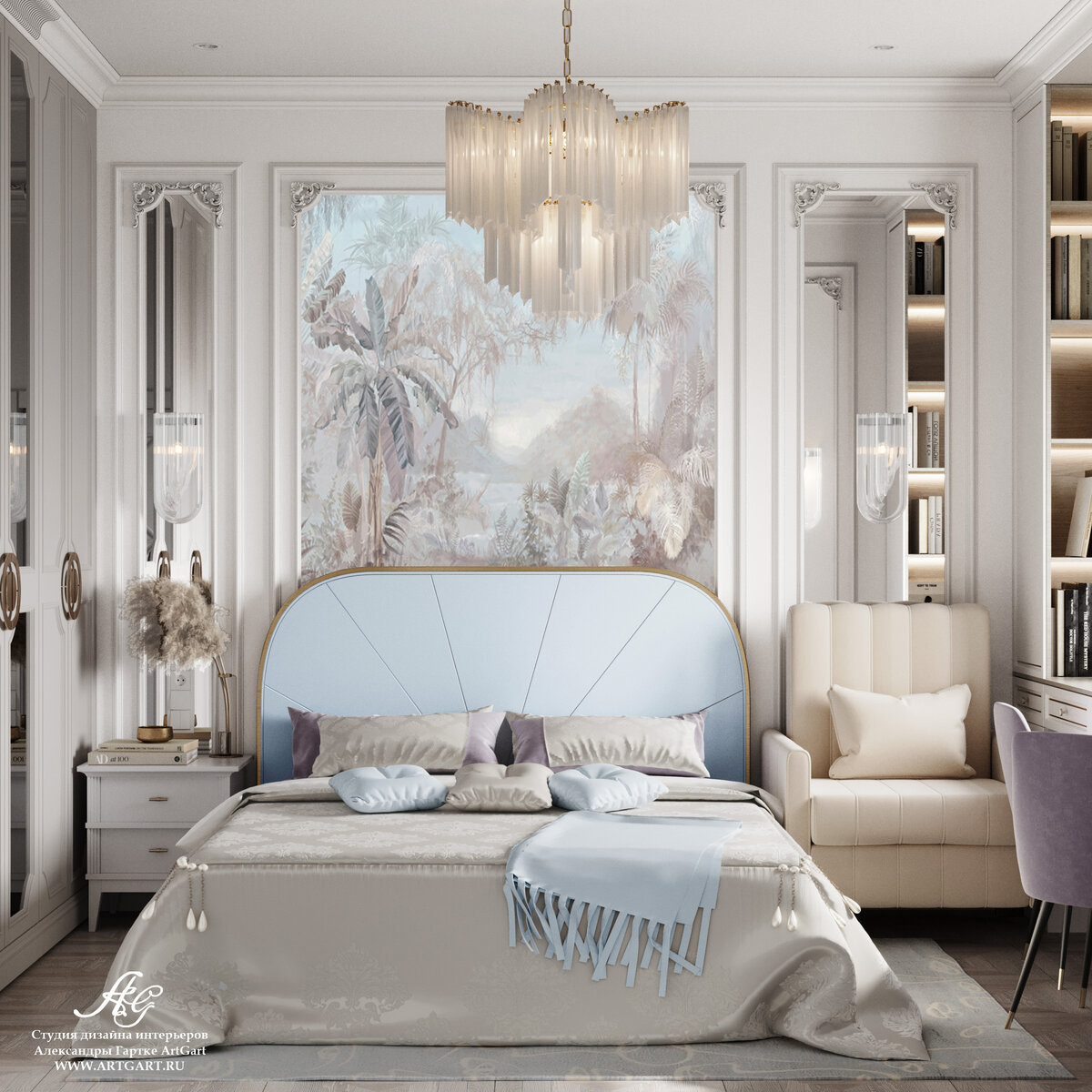 Сливочная спальня маленькой хозяйки с вкраплениями голубого и черничного #шкатулка_на_брюсове Для стены за изголовьем выбирали между двух вариантов обоев, какой вам нравится больше? Помещение небольшое, а функций необходимо было ему нести множество. Спальня в стиле современной парижской классики. На стенах классические молдинги с декоративными уголками, при этом контуры мебели плавные, что характерно для современных интерьеров. Большой шкаф во всю стену с зеркалом. Заметьте, что прикроватная тумбочка перекрывает одну из дверей. Дверь тут фиксирована, доступ к этой зоне шкафа открывается через соседнюю дверь (как угловой шкаф). Ковёр с абстрактным рисунком, в котором можно рассмотреть, что фантазия позволит. У окна зона для учёбы. Нам нужно было опустить подоконник на 5 сантиметров, что он был единый со столом. С внешней стороны дома, мы скрыли это изменение, чтобы окна продолжали выглядеть одинаково при помощи отлива. Отдельного подоконника нет, вместо него столешница, в которой предус