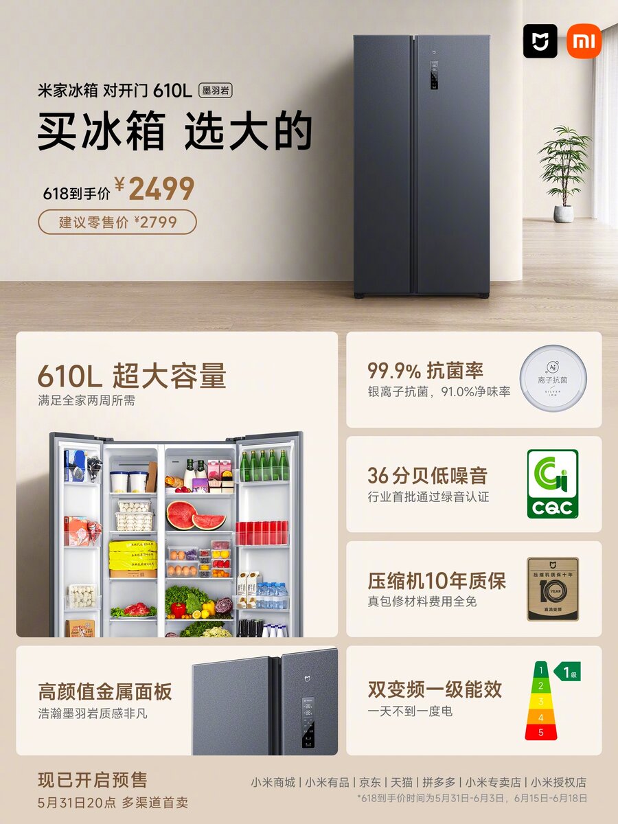 Компания Xiaomi представила новый доступный холодильник Xiaomi Mijia 610L, который относится к категории side-by-side. Он имеет две большие двери, разделённые между собой вертикально. Холодильник Xiaomi Mijia 610L предлагает объём 610 л, которого хватит для большой семьи, в том числе 227 л в морозильной камере и 383 л в холодильной камере. Внутри есть 20 отделений, с каждой стороны по 4 полки с регулируемой высотой установку, опора для двухрядного размещения, 4 датчика температуры. Он оснащен антибактериальной системой очистки ионами серебра, которая надежно предотвращает развитие и распространение вредных бактерий, микробов и болезнетворных грибков, а также запахов. Холодильник отличается низким уровнем шума всего 36 дБ, есть возможность подключения к приложению Mijia. На компрессор предоставляется 10-летняя гарантия. Холодильник будет предлагаться за 375 долларов.