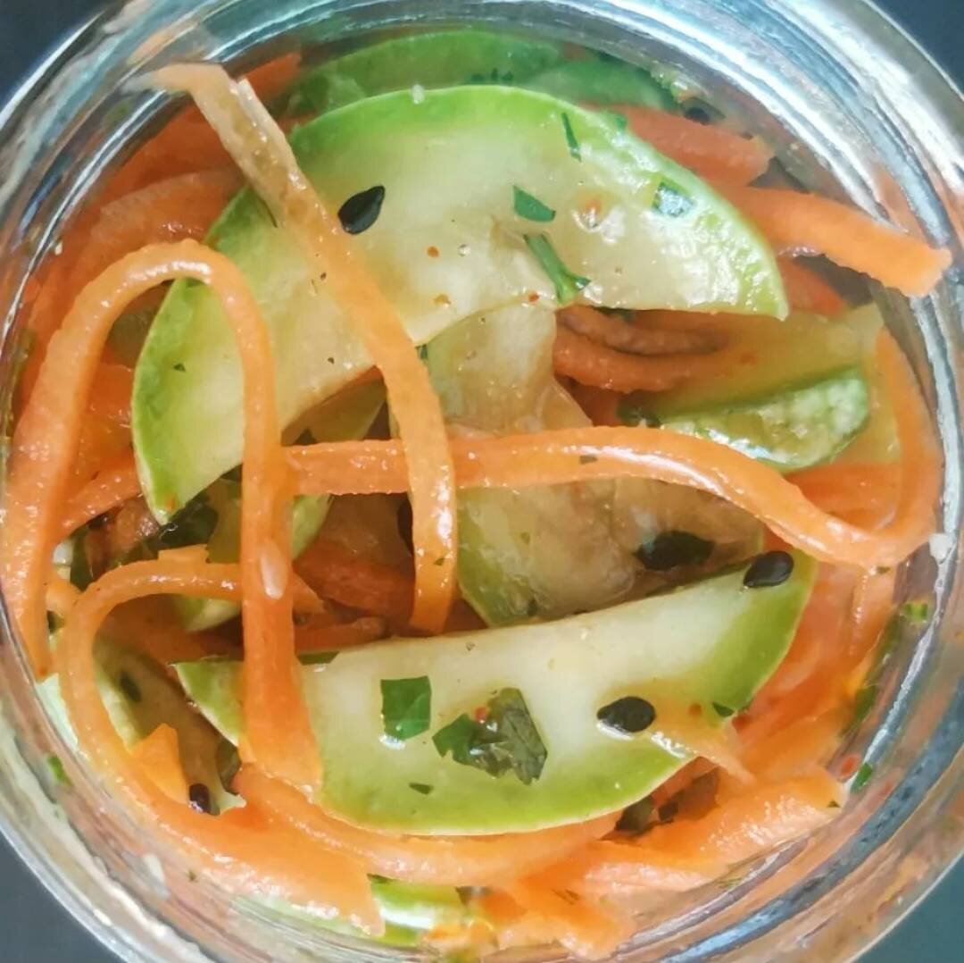 #рецепт #закуска #непп #дефициткалорий Ингредиенты: Кабачки, Морковь, Чеснок, Кунжут, Перец белый молотый, Перец красный острый молотый, Кориандр, Соль, Сахар, Приправ для корейской моркови, Лук репчатый, Масло растительное, Уксус Способ приготовления: Кабачки нарезать ломтиками. Морковку натереть на тёрке тонкой соломкой. Добавить соль, сахар и все перемешать. Дать постоять 20 минут. Слить отделившийся от овощей сок. Сверху выложить мелко нарезанный чеснок, специи и кунжут. Лук нарезать и обжарить на растительном масле, до очень тёмного цвета. Затем раскаленное растительное масло вылить на специи через сито, чтобы лук не попал в салат. Все хорошо перемешать и добавить пару капель уксуса, снова перемешать. Зеленушка по желанию. Поставить в холодильник на часок и все готово.