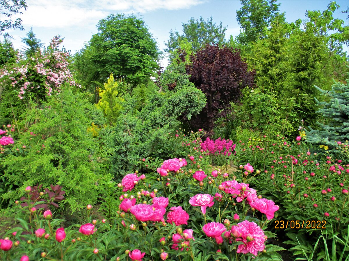 Я очень часто рассматриваю фото разных садов. Многому учусь и позже применяю в своём саду. Цветы у большинства одинаковые, но сажают их все по- разному. Когда - то рассматривала какие цветы с какими растениями лучше сочетаются , нравится , когда на фото общий вид сада или фото отдельных участков сада. Можно понять, что нравится и что не нравится. Мой сад 20 соток и вариантов посадки растений очень много. Саду уже 12 лет и очень разрослись деревья. Сад кажется сплошным лесом. Но на самом деле по всему саду тропинки и везде можно пройти не задевая кустарники и деревья. Я выбрала для себя сад- лес. Растений очень много самых разных и постоянно покупаю новые. Не люблю поляны и газоны. Растут разные сорта туй - Восточная, "Рейнгольд" и пять туй "Смарагд". Рядом с туями растут казацкие можжевельники. Я их стригу. Справа цветёт лихнис Вискария. Слева большой куст - вейгела. На заднем плане рябина и клён платановидный. У пруда расцветают ирисы сибирские. Тут же на островке