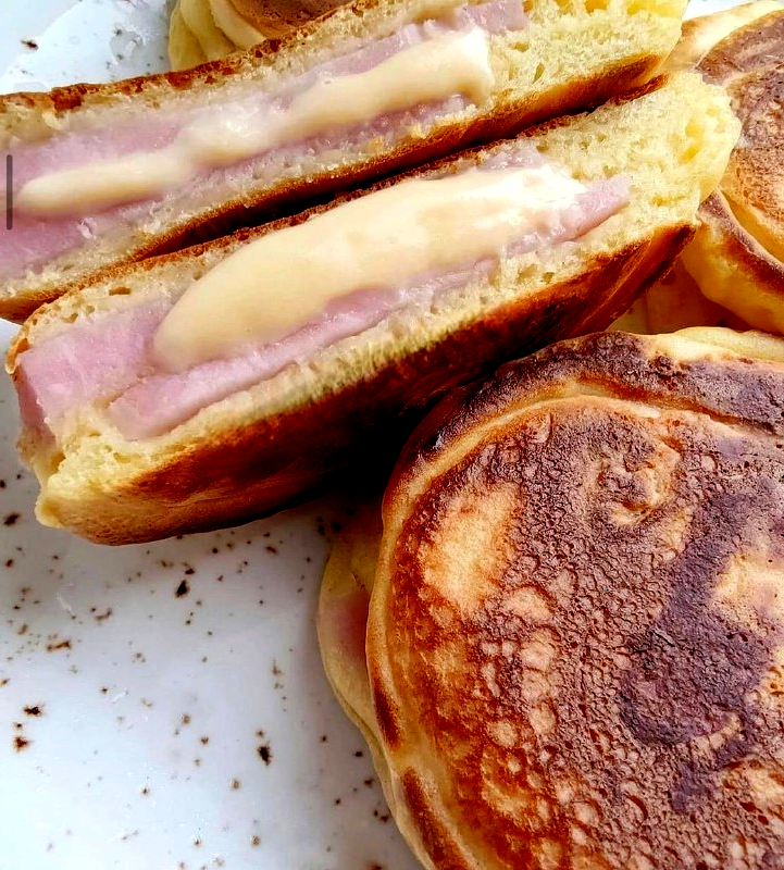 - Разогреваем сковороду и выкладываем оладушки, сверху кладем ветчину, сыр, ветчину и покрываем еще одной ложкой теста, так чтоб начинка была закрыта.