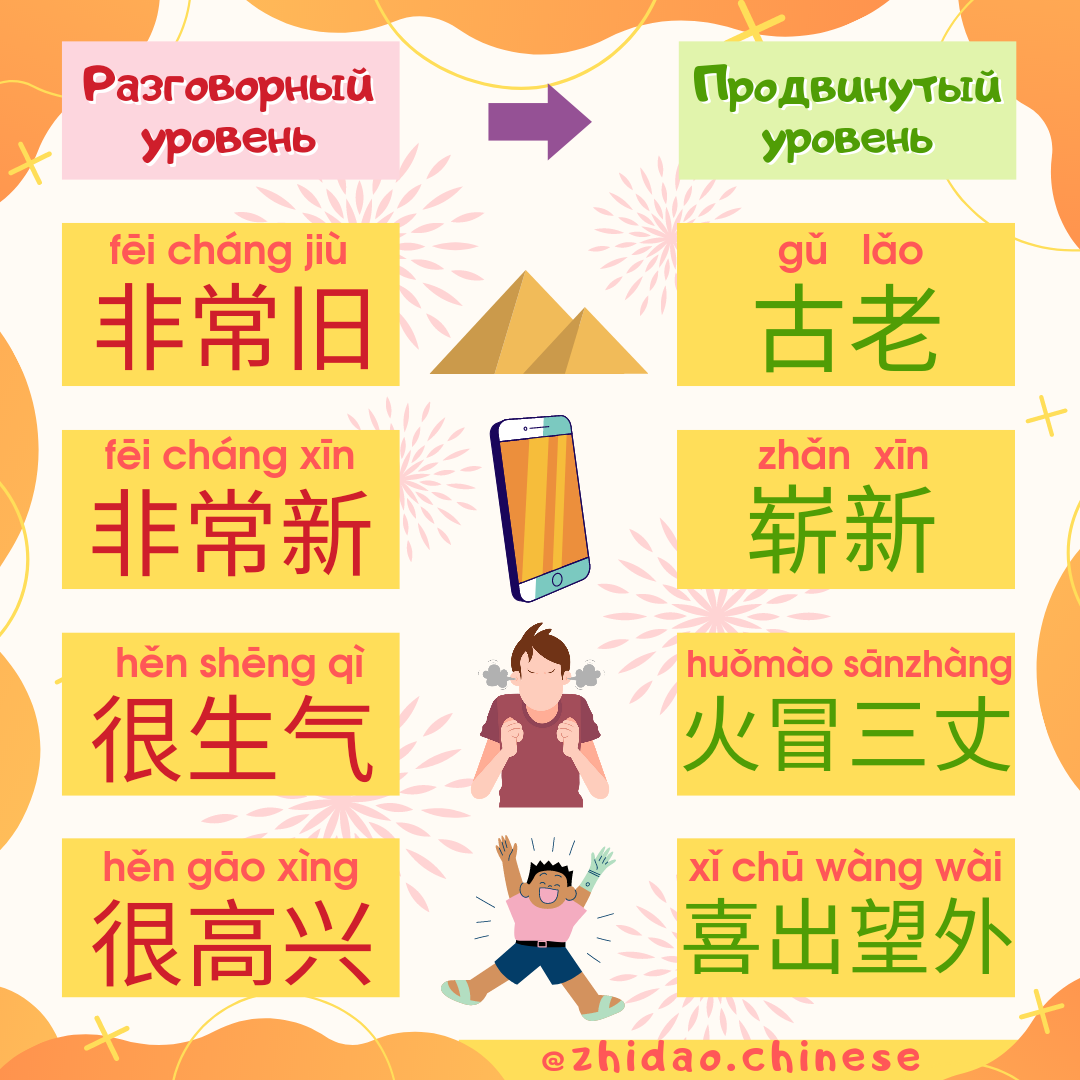 #zhidao_синонимы Сегодня делимся с вами ещё одной подборкой синонимов к разговорным фразам! 🗣️ 🔊 Открывайте видео и включайте звук, чтобы услышать, как произносится каждое слово! 🏚️ 非常旧 fēicháng jiù - 古老 gǔlǎo - очень старый, древний 🆕 非常新 fēicháng xīn - 崭新 zhǎnxīn - новейший, новехонький 💢 很生气 hěn shēngqì - 火冒三丈 huǒmào sānzhàng - сильно разозлиться, прийти в ярость 🤩 很高兴 hěn gāoxìng - 喜出望外 xǐ chū wàng wài - очень обрадоваться, неожиданная радость, приятный сюрприз И примеры с новыми словами: 🔸这是个古老的传说。 Zhè shì gè gǔlǎo de chuánshuō Это древняя легенда 🔸她穿着一件崭新的衣服。 Tā chuānzhe yí jiàn zhǎnxīn de yīfu На ней была новехонькая одежда 🔸他火冒三丈,问是谁偷的。 Tā huǒmàosānzhàng, wèn shì shéi tōu de Он пришел в ярость и спросил, кто украл 🔸这个消息让她喜出望外。 Zhège xiāoxī ràng tā xǐchūwàngwài. Эта новость привела ее в небывалый восторг 📝 Ссылка на карточки Quizlet для изучения новых слов: https://quizlet.com/_bmfa5n?x=1qqt&i=2r5snr 📚 Хотите, чтобы Вы или Ваш ребенок заговорили на китайско