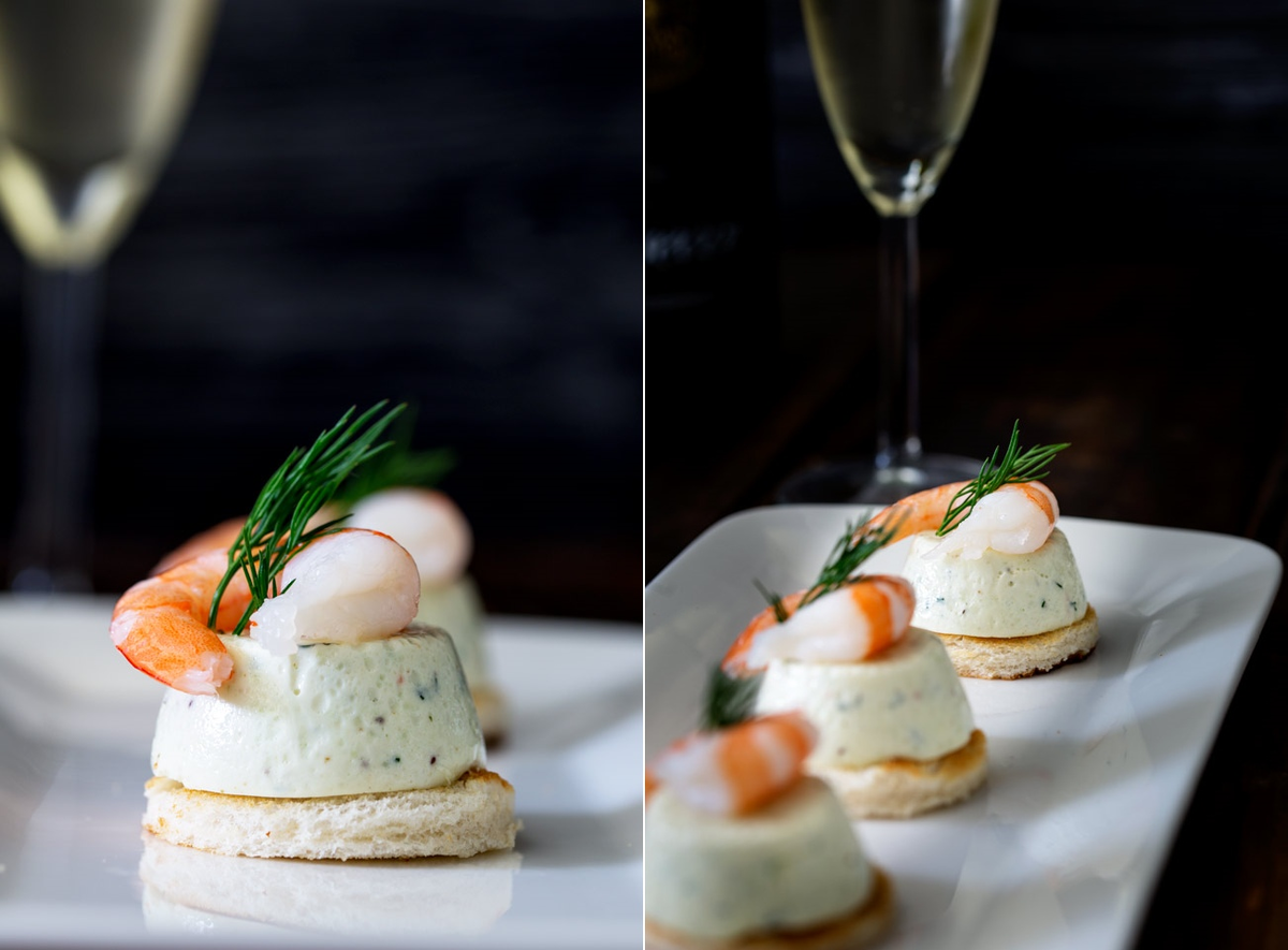 ИНГРЕДИЕНТЫ: 5 ст.л белого винного уксуса, 1 ст.л порошкообразного желатина, 2 ч.л сахарной пудры, 1 крупный огурец, 200 г сливочного сыра, 100 мл сметаны, 1/2 ст.л свежего укропа, 1/2 ч.л. соли, 1/4 ч.л. чёрного перца, 4 ломтика хлеба, 16 креветок (очистить и отварить заранее), свежий укроп.