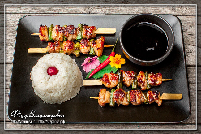 Якитори нэгима — японские шашлычки из куриного бедра с зеленым луком Якитори нэгима (ねぎ間) это японские шашлычки из мяса куриного бедра. Также вместе с курицей на шпажке обжариваются куски лука-порея, который, впрочем, сейчас все чаще и чаще заменяется обычным зеленым луком. Якитори — это общее название блюд из курицы, поджаренной небольшими кусочками на шпажках. Причем каждый вариант имеет собственное название. Так кава — это шашлычки из куриной кожи, момо — из мяса бедрышек, цукунэ — из куриного фарша, а сасами — из куриного филе. Подается якитори обычно с соусом тарэ, который очень прост в приготовлении. Для яитори нэгима понадобится РЕКЛАМА Готовим якитори нэгима — куриные шашлычки с луком Чеснок и имбирь чистим и нарезаем пластинками. 50 мл соевого соуса смешиваем с водой и мирином. Добавляем сахар и крахмал. Тщательно все перемешиваем, чтобы весь сахар растворился. Добавляем одну-две пластинки имбиря. Можно добавить и немного чеснока. Куриное мясо нарезаем небольшими кусками