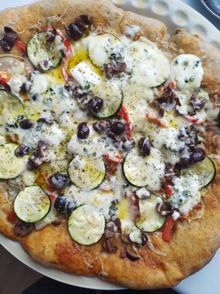 Пицца тоже бывает полезной? Конечно, если в ней много клетчатки, свежих сочных овощей и хорошего настроения! #пп #пицца Ингредиенты: Тесто, теплой воды, дрождей, оливкового масла, сахара, соли, ржаной муки, пшеничной муки, Начинка, маленькая цукиния, луковицы шалот, паприка, оливок, ферментного сыра, сыра с синей плесенью, Соус, помидора в собственном соку, свежий базилик, чеснока, соль, перец, чили перец Способ приготовления: Начать конечно нужно с теста. В воду добавить дрожжи и сахар. Перемешать и дать постоять 10 мин. В воду с дрожжами влить оливковое масло, всыпать щепотку соли и добавить половину от мучной смеси. Все тщательно перемешать и оставить на час в теплом месте. По прошествии часа всыпать остаток муки и замесить гладкое однородное тесто. Оно не должно липнуть к рукам, но будет живое и очень мягкое. Смазать тесто оливковым маслом и накрыть полотенцем. Оставить на 1.30-2 часа. Тем временем подготовить соус: вилкой размять помидоры в собственном соку, порвать базилик, добав