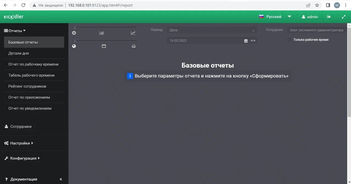 Сервер настраивается через веб-интерфейс. Функционал просто поражает. Можно создавать самые различные отчеты по сотрудникам. Можно выбрать любого работника и посмотреть его продуктивность.