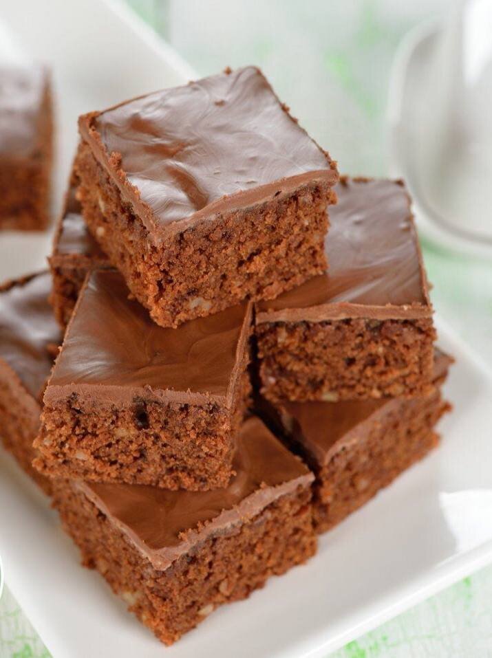 4. Вынуть корж из духовки. Через несколько минут залить его отложенной шоколадной смесью. Дать остыть и разрезать пирог на квадраты.
