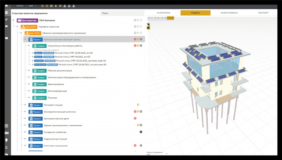 Plan-R позволяет импортировать 3D-модель объекта и связывать ее элементы с работами различных графиков: СМР, контрактации, платежей, поставок, наладки и пр. Объем выполненных работ автоматически отображается на 3D-модели. Отклонения по срокам (при срывах строительно-монтажных работ, поставок, контрактации) визуально выделяются. Подобные функции есть в Spider Project.