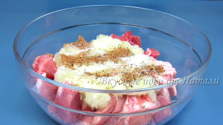 Мясо нарезаем на крупные кусочки, а половину, от нужного количества, лука натираем на крупной терке (или же можно лук измельчить в блендере). Перекладываем их в миску, добавлем соль, перец по вкусу. Тщательно перемешиваем.