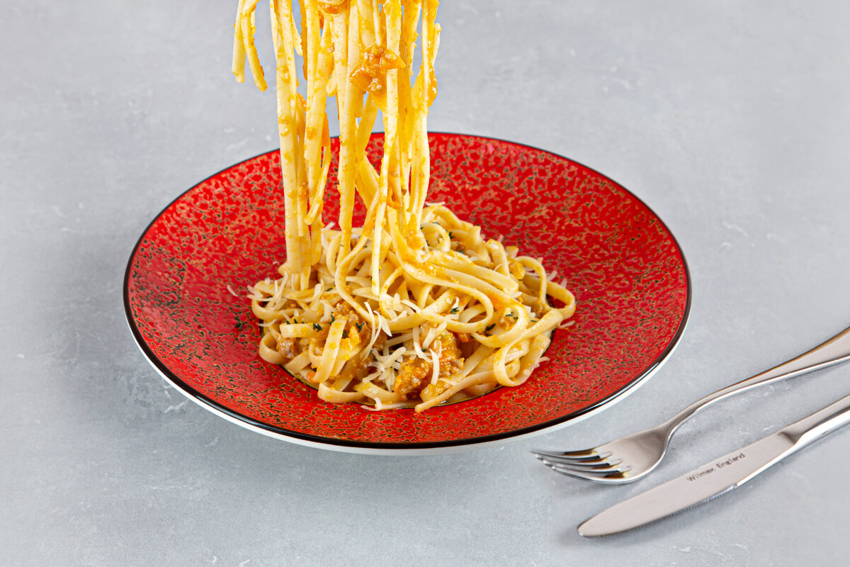 Паста болоньезе является традиционным итальянским блюдом. Классический рецепт приготовления основан на таких ингредиентах, как: смесь говяжьего и свиного фарша, лук, морковь, томаты, сельдерей и сливки. Но сегодня мы делимся с вами авторским рецептом болоньезе с тыквой от Джошуа Макфаддена. В нем тыква заменяет томат. У тыквы более нежный и округлый вкус, поэтому хорошо поперчите соус.