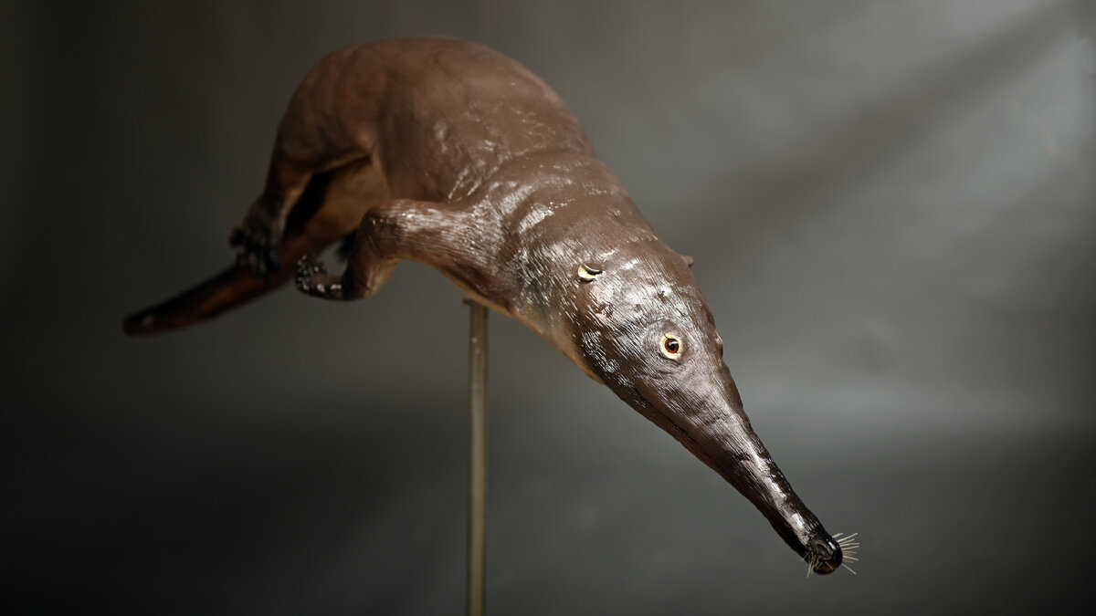 Это Качхицет (лат. Kutchicetus minimus), пресловутый "кит с лапками"! Ну, точнее предок китов. Его реалистичную реконструкцию изготовил наш друг Валентин Попов. Полуводное животное, переходная форма к современным китообразным, обитало на прибрежной линии моря Тетис. Остатки были найдены в Индийском округе Кач, откуда вид и получил своё название. Масштаб скульптурной реконструкции - примерно 1:2. Валентин Попов (автор реконструкции, присутствует на последнем фото) пишет: "Скульптура сделана из сложного в работе самоотвердевающего двухкомпонентного материала. Которым я, к слову, совсем недоволен. Нет, слепить что-то можно и из хлебного мякиша, и что-то получится. Но советовать подобные материалы для работы я бы не стал ни в коем случае. В ближайшее время я планирую сосредоточить свои силы исключительно на скульптурном пластилине и силиконе, так как только они полностью позволяют мне осуществлять в должной форме те образы, которые возникают у меня в голове". Источник: Studio Delvesto (сту