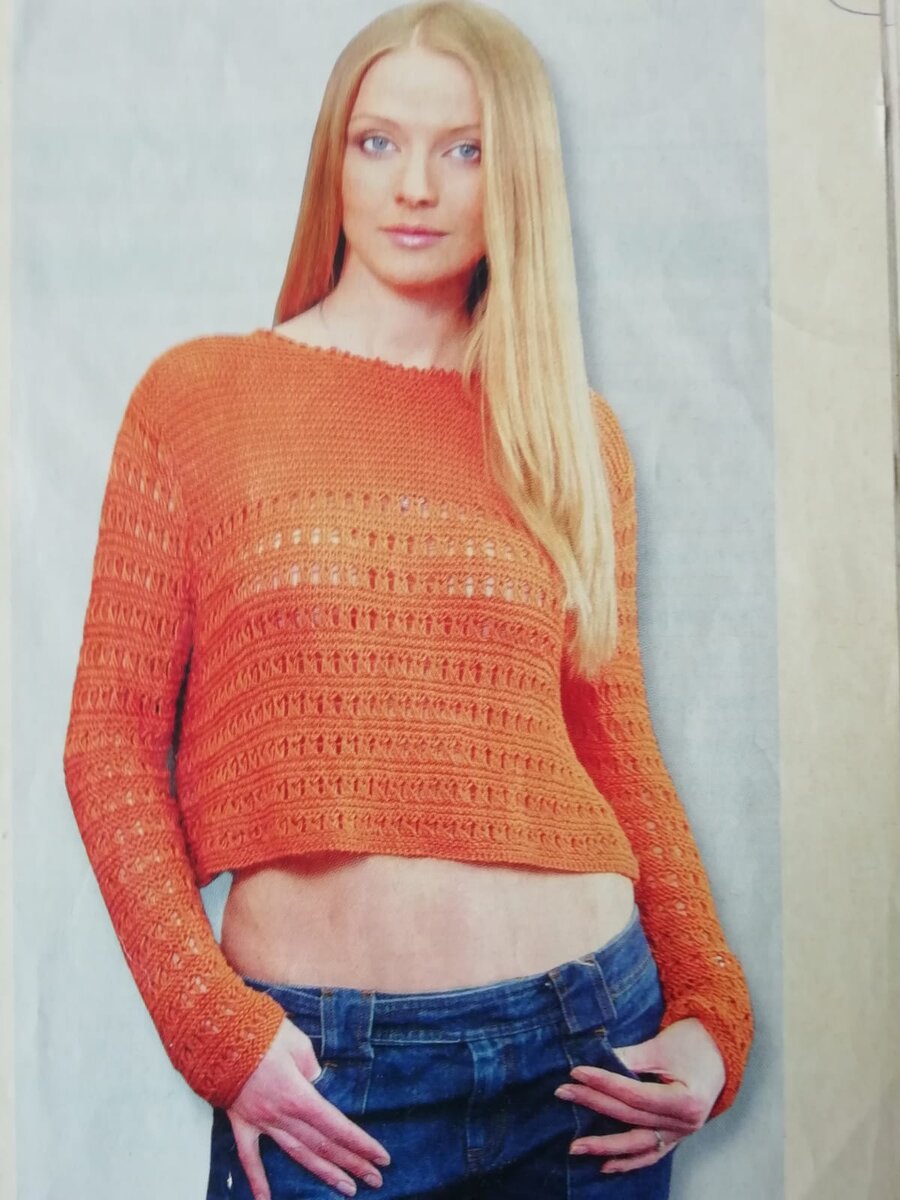 Размер 40/42 (европейский) пряжа 105/120м - 50г., спицы 3, крючок3,5. Платочная вязка: лицевые и изнаночные ряды-лицевые петли. Плотность вязания: 21п и 30р.= 10*10см. Ажурные дорожки: число петель кратно 3+2 кром. Вязать по схеме, на которой приведены лицевые и изнаночные ряды. Раппорт повторять с 6-го по 11-й р. ПЕРЕД: набрать 110п. и вязать по схеме через 22 см = 47р., от наборного края выполнить убавления для пройм с обеих сторон в каждом 2-м р., 1*4,1*3 и 2* 1п. На спицах осталось 92 п. Далее вязать платочной вязкой. Провязать 11 см = 34 р., закрыть для выреза горловины средние 18п., обе стороны закончить раздельно. Для закругления закрыть с внутреннего края в каждом 2-м р. 1* 3,2 *2,4 *1 п. Для скоса плечевого шва закрыть 1 *8 и 3 * 6п. СПИНКА: вязать так же, но вырез горловины закрыть по прямой. РУКАВА: набрать 44п. и провязать 13 раппортов узора по схеме до проймы. Для расширения рукава равномерно прибавить с каждой стороны через равные промежутки рядов по 12п. На спице п
