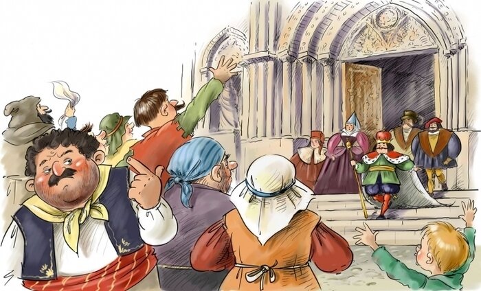 Подошел крестьянин поближе, видит: идут из дверей придворные, министры, советники, а вот и сам король!