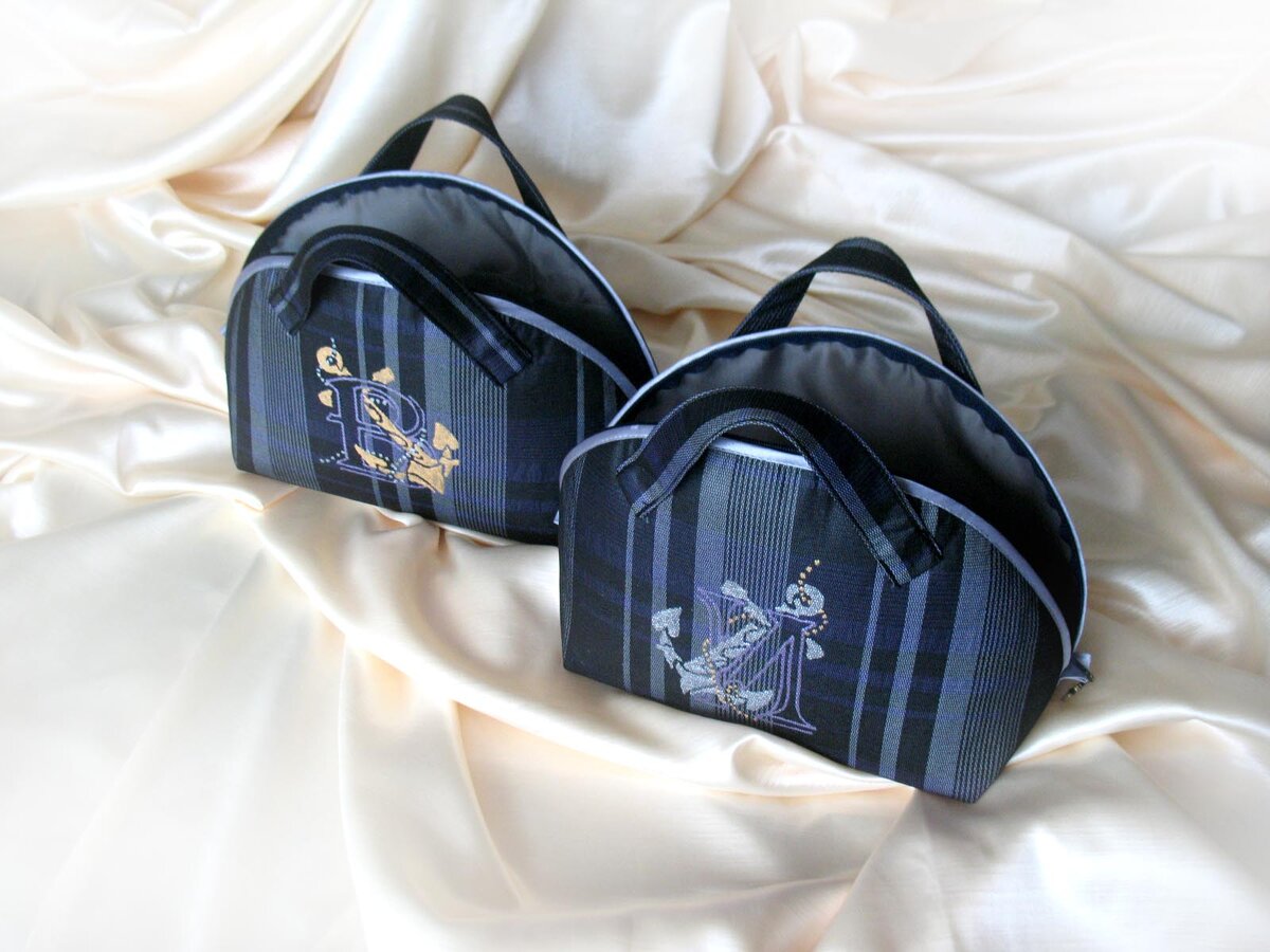 Очередной заказ для двух друзей моряков поступил мне. Два несессера моей любимой округлой формы - саквояж. Что бы ни говорили, что это женственная форма, из соответствующего материала все равно получается мужской несессер. А ткань я взяла суровую, черно-темную плотную плащевку в сложную клетку. Несессеры должны быть именные и с якорями. Предложила сделать роспись специальными красками по ткани металлизированными. Все получилось замечательно, сначала сделала макет монограмм с якорями В и И, заказчик одобрил. Ткань темная и с помощью кальки нанести рисунок на основу несессера для дальнейшей росписи нельзя. Поэтому наносила эскиз на ткань другим способом: с помощью иглы. У меня есть мастер-класс, как это сделать : Подкладка внутри скромная, однотонная, пара кармашков для мелочей. Отделка по краю серо-серебристой атласной бейкой в тон полоскам на основной ткани. На застежки молний подвески закрепила - тоже якоря. Получилось индивидуально и стильно, на мой взгляд. Как думаете, не слишком за