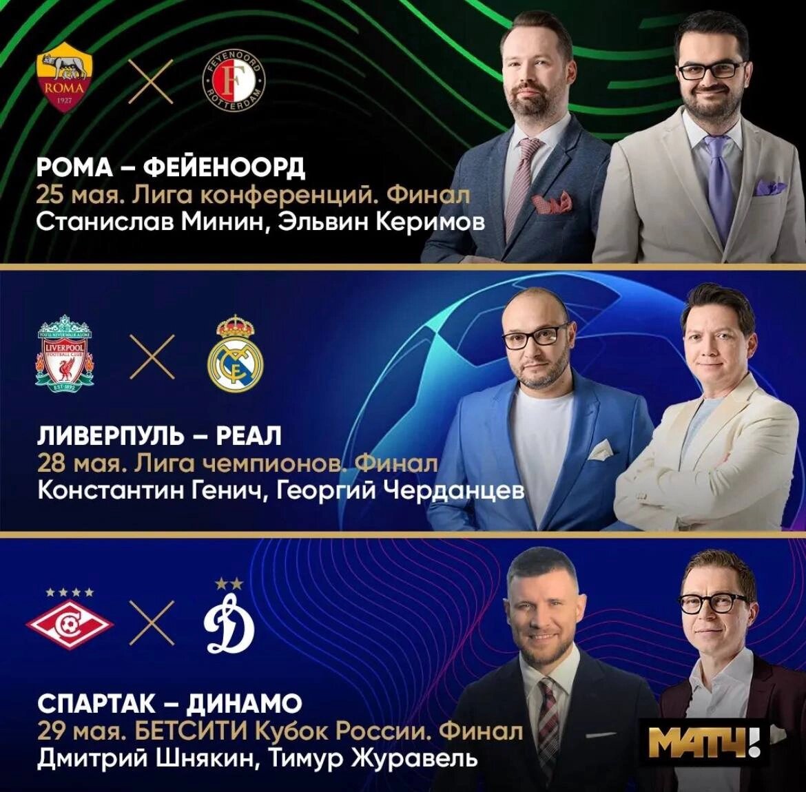 Приветствуем каждого зрителя и почитателя отечественного и мирового футбола! На связи авторы ТГ-канала «Во все тяжкие» Павел и Владислав. Не будем многословны во вступительной части нашего повествования о трёх больших финалах, которые дарит нам вторая половина текущей недели, и просто пожелаем вам приятного прочтения! Сегодня вечером, в 22:00 по московскому времени, в столице Албании - Тиране состоится первый в истории финал третьего по силе еврокубка - Лиги конференции. На поле стадиона «Арена Комбетаре» схлестнутся итальянская «Рома» Жозе Моуриньо и голландский «Фейеноорд» Арне Слота. Комментировать данную встречу будут журналисты Станислав Минин и Эльвин Керимов. Уверены, что очередное противостояние больших европейских клубов не сможет не доставить удовольствия. Кто же станет победителем и войдёт в историю будем узнавать уже через несколько часов. В субботу, 28 мая, состоится, в какой-то мере тревожащий душу отечественного болельщика, финал Лиги Чемпионов. Почему тревожащий, дум