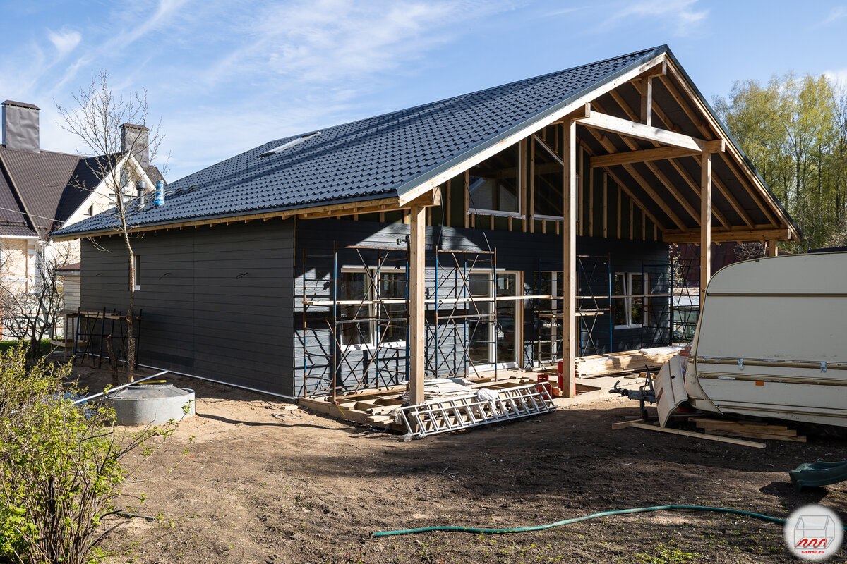 Началась ,,,,,стройка примерно год назад, летом 2021 года залили УШП и поставили коробку под крышу. Затем был перерыв и весной 2022 стройка продолжилась. По окончании текущего этапа дом будет полностью готов к внутренней чистовой отделке.