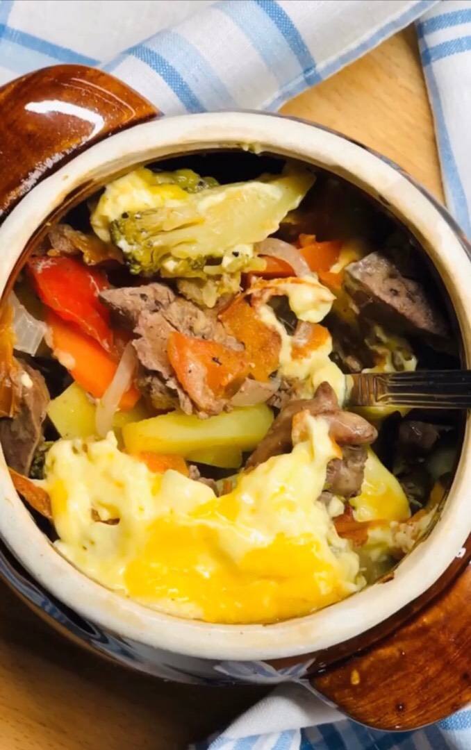 Готовить будем в микроволновой печи. На быструю руку. Овощи и мясо для этого блюда можете взять разнообразные, какие есть в холодильнике. Это обед, ужин и праздничное блюдо для гостей. Ингредиенты: крупные картофелины, крупная морковь, шампиньон, брокколи, крупная луковица, болгарский перец, куриной печени, Соль, специи , воды в горшочки, майонеза Способ приготовления: Порезанные овощи и печень раскладываем слоями. Солим, перчим. Наливаем воду, соль и перец смоется. Сверху выкладываем майонез. Ставим в микроволновую печь на полную мощность на 30 мин.