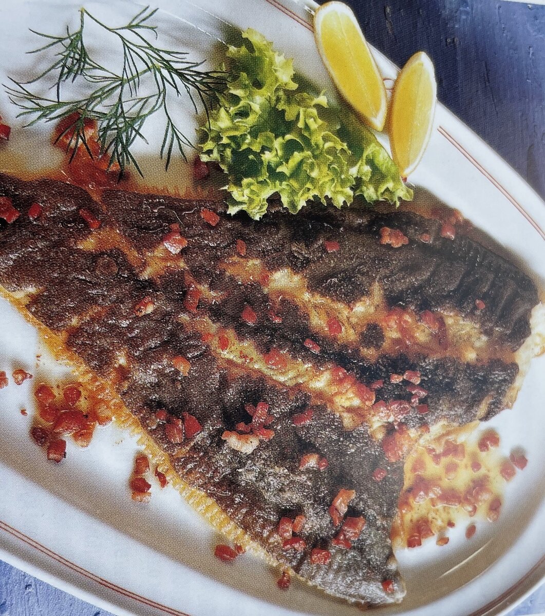 2 разделанных камбалы (прибл. по 300 г) соль, молотый черный перец 30 г пшеничной муки (соотв. прибл. 4 ст. л. муки) 150 г копченой свиной грудинки или бекона 3–4 ст. л. растительного масла лимон, разрезанный на дольки листики укропа 1. Камбалу помыть под холодной водой, обсушить бумажным полотенцем, натереть солью и перцем, обвалять в муке. Грудинку нарезать мелкими кубиками. 2. Растительное масло разогреть в большой сковороде. Обжарить в нем кубики грудинки. Кубики вынуть из сковороды и поставить в теплое место. 3. Тушки камбалы жарить по очереди (или вместе: в зависимости от размеров сковороды) в жире от жарки грудинки. Каждую рыбу жарить с обеих сторон прибл. 10 мин. до приобретения коричневого цвета, при необходимости добавить немного растительного масла. Камбалу снять со сковороды, положить на подогретое блюдо и поместить в теплое место. 4. На камбалу положить кубики грудинки. Камбалу украсить кусочками лимона и веточками петрушки и подать на стол. Подавать с: отварным картофелем