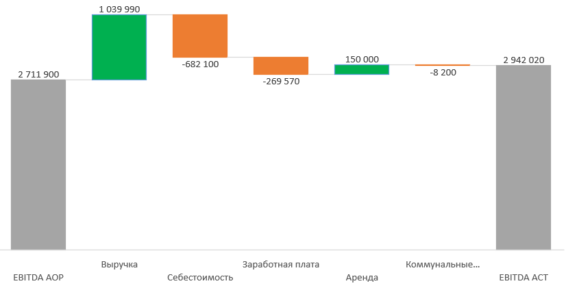 Смысл диаграммы Водопад в том, что она показывает, какие факторы повлияли на разницу между двумя значениями (в нашем случае, план и факт).