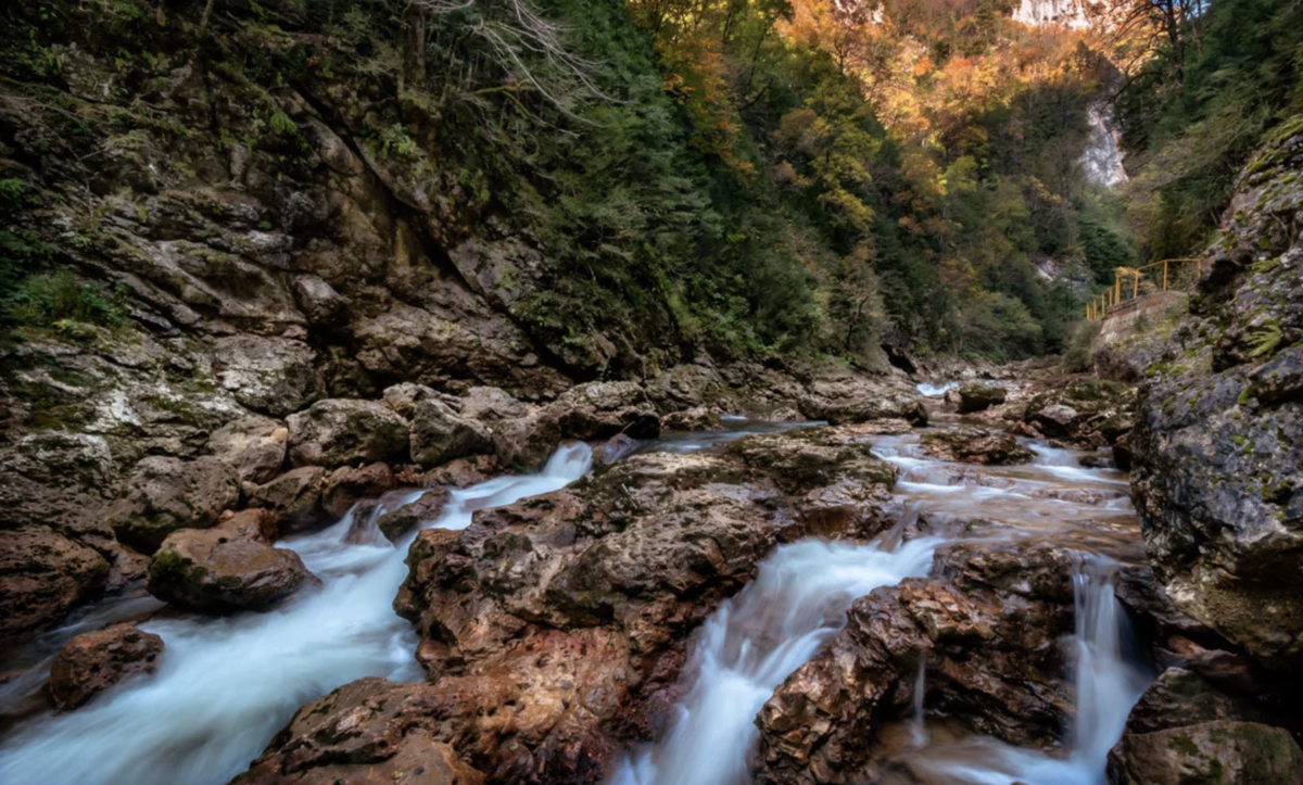 Это одна из самых впечатляющих достопримечательностей Краснодарского края, ежегодно притягивающая тысячи туристов. Гуамское ущелье является границей между двумя цепями гор - Лаго-Наки и Гуама. Здесь протекает рука Курджипс, бьют тёплые родники и произрастают тропические растения. Часть флоры реликтовая (не затронутая деятельностью человека и сохранявшаяся многие века в неизменном виде). Благодаря уникальным ландшафтам сформировались водопады высотой до 80 м. Глубина ущелья достигает 480 м, а самое узкое расстояние между отвесными скалами составляет всего 2 м. Летом в ущелье температура не поднимается выше +25 градусов, а зимой редко опускается ниже нуля. Название ущелья с адыгейского языка переводится как "зловоние", "затхлый воздух". История формирования В Гуамском ущелье можно изучать историю развития нашей планеты. Формирование каньона началось около 130 млн. лет назад, на рубеже юрского и мелового периодов (мезозойская эра). В то время здесь было море. Об этом свидетельствуют слои