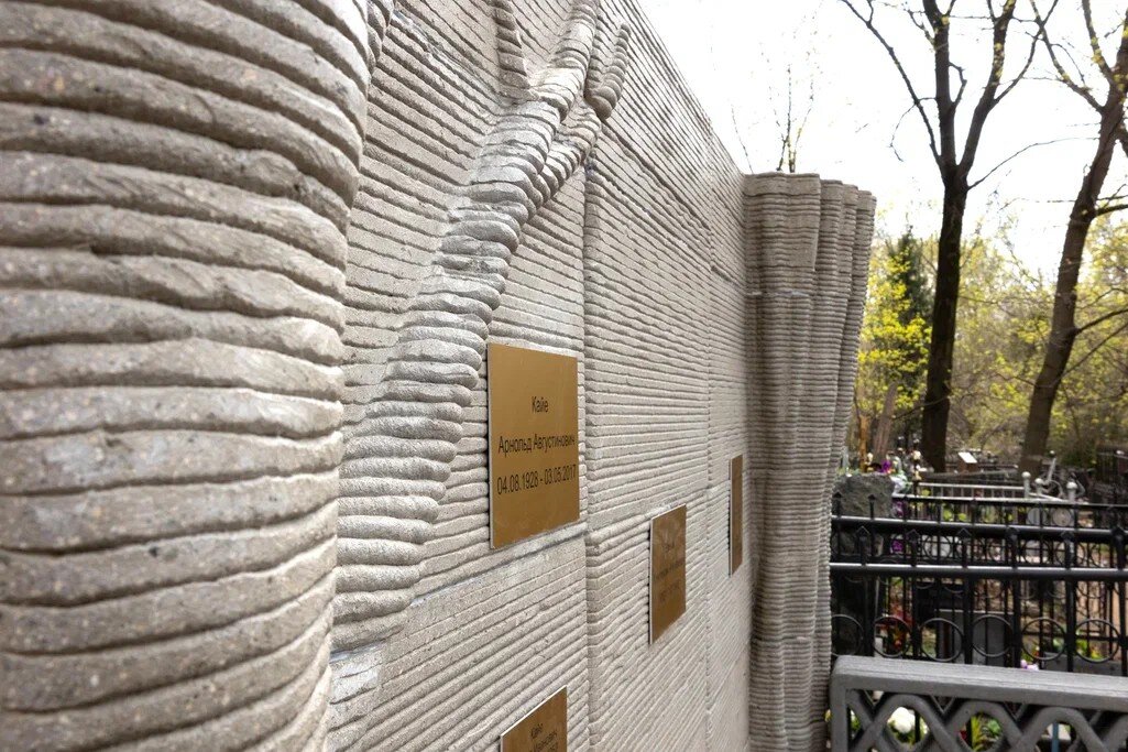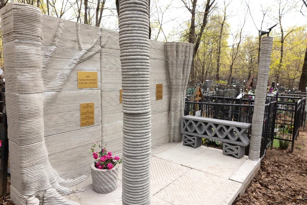 На столичном Ваганьковском кладбище установлен первый в мире, как утверждают его создатели, надгробный памятник, напечатанный на 3D-принтере. Он имеет габариты 2 х 3 х 1,8 м и весит 2 тонны. Стоимость проекта составила 300 000 рублей. Автором памятника выступил Александр Жданов, который решил установить его на могиле своего дедушки, Кайе Арнольда Августовича. Памятник представляет собой сцену с занавесом и специальной подсветкой, которая освещает памятник в тёмное время суток. Прожекторы питаются от солнечных батарей. Мой дедушка – Кайе Арнольд Августович – заслуженный деятель культуры Советского Союза, ведущий художник по свету, посвятивший более 50 лет драматическому театру им. Станиславского. Дружил и работал с Евгением Леоновым, Михаилом Яншиным, Лилией Гриценко. Этот памятник передает его характер, смелость и творческий путь.Александр Жданов От рождения идеи до установки памятника прошло полгода, но срок изготовления занял около месяца. Реализовала задуманное команда 3D4Art. Памят