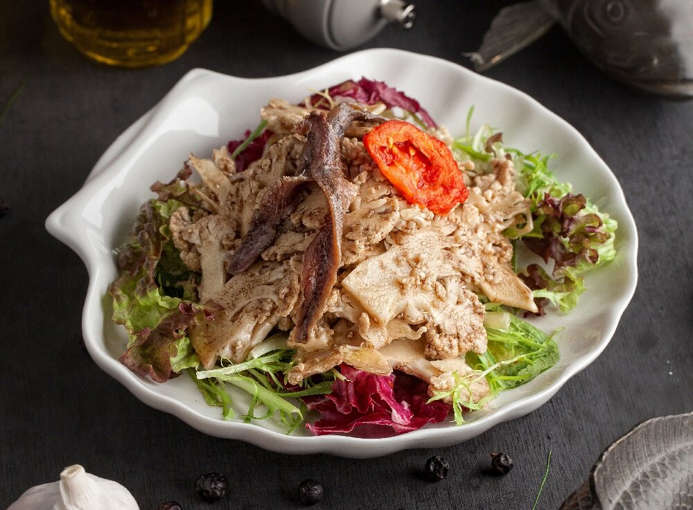 3) Микс листьев салатов разложите по тарелкам. Сверху выложите слайсы цветной капусты, на них кусочки анчоусов.