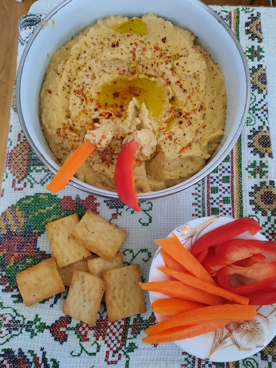 Подаётся хумус в качестве закуски или холодного соуса с брусочками свежих овощей, лавашем, хлебом, чипсами. У меня морковка, болгарский перец, хорошо пойдёт и сельдерей, несладкие сухие крекеры.