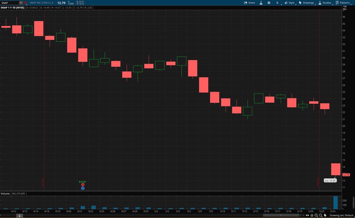 На прошлой неделе главный удар пришёлся на ритейл, на этой неделе это социальные сети. Вчера акции Snap ($SNAP) упали более чем на 43%. В нормативной документации владелец Snapchat заявил, что "макроэкономическая среда ухудшилась дальше и быстрее, чем ожидалось". Здесь у меня есть сомнения: связана ли проблема с макроэкономикой или с тем простым фактом, что Snapchat не так популярен, как TikTok? Новостей от Snap было достаточно, чтобы обрушить акции и других социальных сетей. Акции Facebook , или более формально, Meta Platforms ($FB), упали на 7,6%, и они до сих пор не оправились от суперудара, который они получили два месяца назад. Google, формально называющийся Alphabet Inc. ( $GOOGL), упал на 5%?, а Pinterest ($PINS) потерял 23%. В ходе вчерашних торгов акции Twitter ($TWTR) упали до $35,40. Цена предложения Илона Маска уже более чем на 50% выше, чем текущая цена акций Twitter, и теперь кажется, что это явный признак того, что сделка с Маском вовсе не состоится. Люди голосуют против