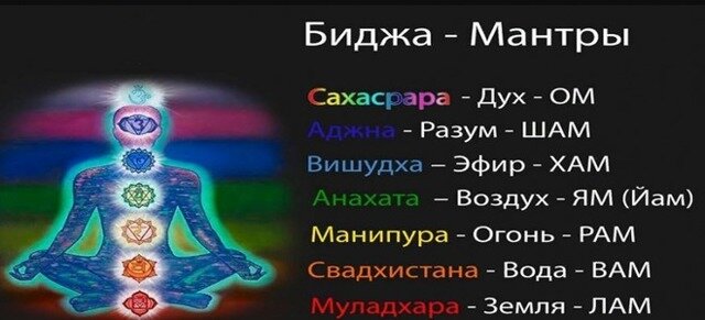 У каждой чакры есть своя стихия -элемент и звук мантры. Чтобы активировать чакру, необходимо на элемент чакры к примеру - воду, читать мантру звука этой чакры - ВАМ. Речь идёт о чакре - Свадхистана. Мантра со звуком чакры читается от 7 до 108 раз. Дальше мы делаем с этим элементом то, что обычно с ним делают, воду пьют, или ею умываются. Ниже приведены звуки чакр и элементы которым они соответствуют. 1-я чакра - Муладхара, её элемент - земля и звук мантра - ЛАМ. 2-я чакра - Свадхистана, её элемент - вода и звук мантра - ВАМ. 3-я чакра - Манипура, её элемент - огонь и звук мантра - РАМ. 4-я чакра - Анахата, её элемент - воздух, звук мантра - ЯМ. 5-я чакра - Вишудха, её элемент - эфир, звук мантра - ХАМ. 6-я чакра - Аджна, её элемент - разум, звук мантра - КШАМ. 7-я чакра - Сахасрара, её элемент - дух, звук мантра - ОМ. ---------------- У каждой чакры есть предназначение. К примеру : 1-я чакра Муладхара отвечает за жизненную энергию, деньги и активность. 2-я чакра Свадхистана отв