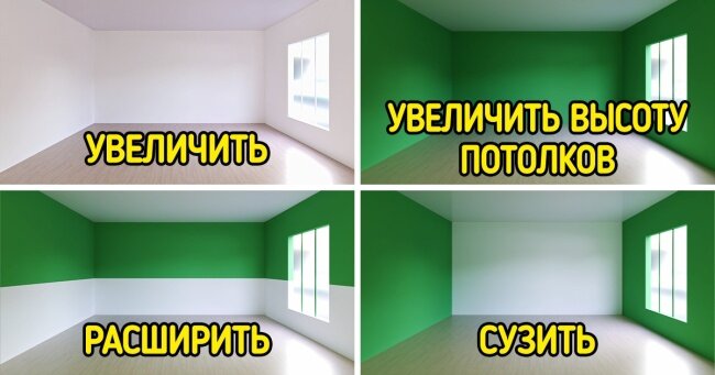 Цвет краски может повлиять на ваше настроение и изменить общий вид интерьера. Хотя цветовое решение не изменит фактический размер помещения, оно позволит визуально сузить, удлинить или расширить пространство. «Бери и Делай» покажет несколько способов, как можно визуально изменить размер комнаты с помощью краски. 1. Чтобы увеличить комнату Увеличение пространства считается самой простой задачей в нашем списке, так как для этого требуется краска всего лишь одного цвета. Вы можете использовать любой оттенок белого или любой бледный или пастельный цвет. Чтобы визуально увеличить комнату, вам нужно покрасить все стены и потолок в один и тот же бледный цвет. Пол тоже желательно сделать светлым, постелив, например, белый ковер. 2. Чтобы визуально увеличить высоту потолков Если вы решили визуально увеличить высоту потолков, выберите 2 цвета краски. Один из них должен быть очень светлым или белым, а второй — глубокого темного оттенка. Далее вам нужно покрасить потолок в светлый тон, а стены — в