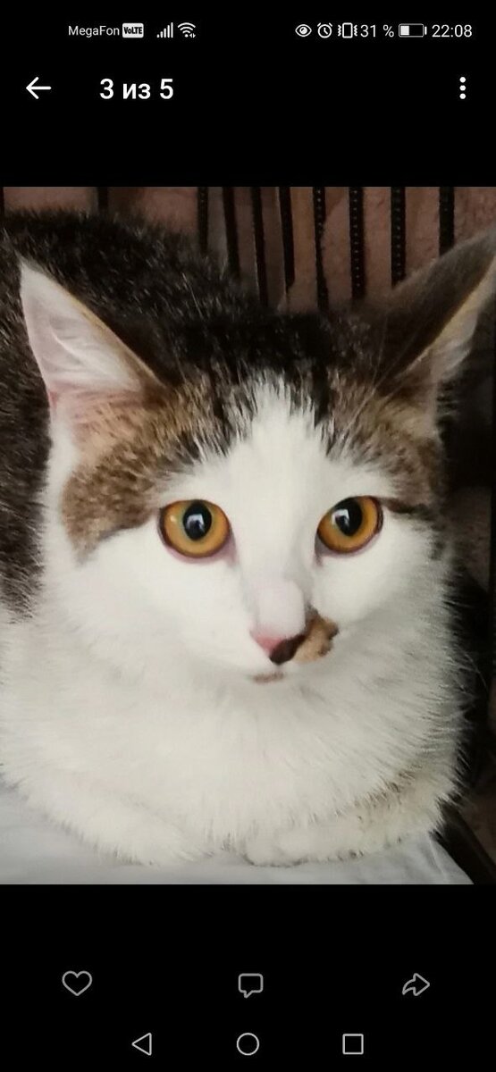 Передаёт всем привет из дома счастливая и довольная кошечка Кнопочка. История её появления у нас шокирует равнодушием и цинизмом людей, живущих на земле и думающих, что они цари и боги. Когда домашняя, а мы в этом даже не сомневаемся, молоденькая кошечка оказалась на улице неизвестно. Стая собак загнала её высоко на дерево, да так, что она не смогла спуститься и сидела там, крича от страха, голода и холода пять суток. Вы только представьте, ПЯТЬ суток! Все это время её истошное мяуканье было слышно на всю округу, но.... никто, ни один человек ничего не сделал для того, чтоб помочь бедной кошечке, из последних сил цепляющейся за жизнь сядя на тонких ветках. Просто по велению бога мимо проходили женщины, которые кормят дворовых кошек, услышали крики, позвонили нам и вот с этого момента началась спасательная операция... С большим трудом нашли машину с лестницей, которая выдвигается до высоты пятого этажа и когда кошке протянули руки, она просто упала в большие и надёжные руки спасателя.