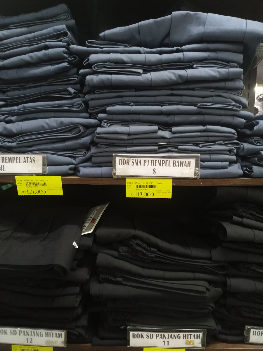 Права на квадроцикл в Индонезии не нужны: В Индонезии несколько цветов школьной формы. Причём я так и не поняла за четыре года, какой цвет когда надо носить. Вот полки в универмаге с нижней частью формы - у мальчиков брюки, у девочек - длинные юбки: Рубашки обычные белые, но есть и с риснуком - тоже надо комбинировать с брюками или юбками. Ещё есть нашивки - у каждой школы свои, с номером и названием. Вот так выглядит форма на школьниках: И вот так: Каждый школьник имеет несколько комплектов формы в каждом классе. Помимо школьной формы в универмаге можно купить укулеле: Но тут они дорогие: 113000 рупий - это примерно 550 рублей, тогда как у частного мастера укулеле можно купить за 300 рублей. В музыкальном магазине выбор тембров больше, но и цены начинаются примерно от 1200 рублей. Где-то я уже говорила, что в Индонезии можно запросто пойти в супермаркет в пижаме. И это не шутка: Некоторые девушки надевают к пижаме хиджаб, а в прохладную погоду куртку сверху, а ещё они при этом накра