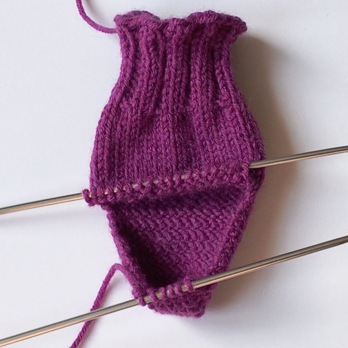 Привет всем, мои дорогие читатели! Я начала вязать новые детские носочки. Так меня захватили мои предыдущие две пары, лиловые и полосатые, что я решила связать ещё. Чем мне нравятся маленькие носочки на детскую ножку? Они вяжутся быстро и быстро становится виден результат. Кроме того, маленькие носочки проще стирать, не нужно запускать машинку, а достаточно замочить их в кастрюльке с жидким порошком на полчаса, а потом прополоскать тёплой водой и высушить на полотенце. На сей раз я взяла для работы пряжу "Кроха " из шерсти и акрила, специальную детскую. Цвет тёмный, похож на сливу. Собственно, изначально я выбирала этот цвет для вязания фруктов и овощей по методичке, и связала зимой инжир. Могу сказать, что вяжется эта пряжа туго, с большим усилием надо вязать каждую петлю. Кстати, вяжу на чулочных спицах троечке. Набрала 36 петель плюс 1 петлю для замыкания в круг, связала 4 см резинкой 2×2, затем также 4 см лицевой гладью, затем объём пятки, затем подняла петли по бокам, после п