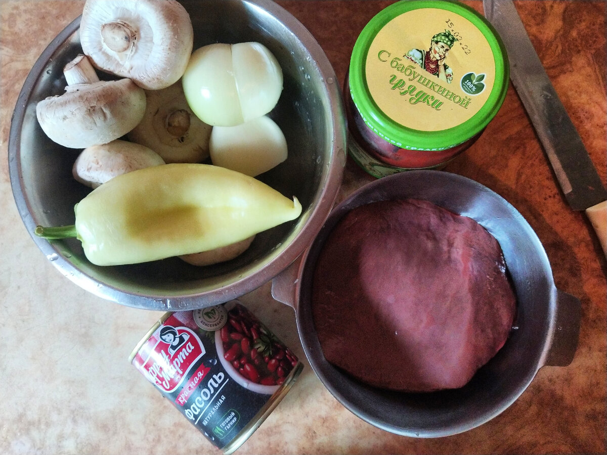 Это блюдо я попробовала у знакомой армянки, и в семье прижилось такое название. Возможно оно имеет другое название. Ингредиенты: Приготовление: Лук нарезать полукольцами и обжарить на небольшом количестве масла Перец нарезать либо полукольцами, либо соломкой и добавить к луку. Грибы очистить и порезать на 6 частей каждый. Когда лук и перец будут почти готовы, добавить грибы и немного посолить. Подготовить две ёмкости - одну с кипятком, другую с очень холодной водой. Вначале на несколько секунд кладём печень в кипяток, за тем опускаем в холодную воду. Это поможет снять без труда пленку. Очистить печень и нарезать небольшими кусочками. Когда жидкость от грибов выпариться, добавить в сковороду печень. Как только печень немного побелела, добавляем заправку. Для этого смешать 2 ст.л томатной пасты, 3 щепотки соли, 2 ч.л. сахара, 1/2 ч.л. Кари, 1 ч.л. кориандра, Чили по вкусу. Все хорошо перемешать, добавить ещё стакан воды и влить в сковороду, добавить фасоль. Тушить под закрытой крышкой