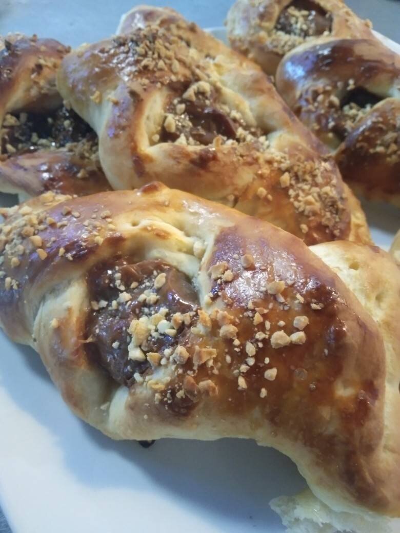 Ингредиенты: муки, молока, сгущённого молока, Соль , дрожжей, Ванилина, сл масла, Для начинки , вареной сгущенки, яйца чтоб обмазать наши булочки , арахиса Способ приготовления: В теплое молоко добавляем сгущёнку. Далее живые дрожжи, соль, ванилин и все перемешиваем, далее муку, все перемешиваем. Далее добавляем мягкое сл масло и начинаем вымешивать тесто. Оставляем на 40 мин тесто на расстойку. Далее когда тесто выросло в объеме делим его на одинаковые кусочки и формируем из него наши булочки. Я сделала начинку из вареной сгущенки, смазала каждую булочку яйцом и посыпала арахисом, выпекала при температуре 180 гр 20 мин.