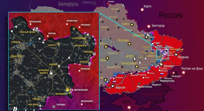 Добрый вечер, уважаемые друзья! Сегодня заканчивается 25 мая и итоговый выпуск боевых действий происходивших сегодня на украинских фронтах. Северное направление. Бои в районе Харькова постепенно затихли. Там короткие перестрелки, но в целом говорить о том, что под Харьковым идут серьёзные боестолкновения нельзя. Всё внимание и все усилия с обоих сторон, постепенно сконцентрировались вокруг Донбасса. Именно здесь происходят основные бои, причём именно сегодня, они вошли в следующую стадию. Потому что, так называемый Северодонецкий — Лисичанский котёл вступил в стадию формирования, то есть оперативного окружения. У ВСУ осталось не так то много времени чтобы принять принципиальное решение, выводить свою группировку или оставить её, как это было в Мариуполе. Хотя с учётом того, что стойкость нынешних войск на Украине намного ниже чем в начале войны, из-за того что большую часть личного состава составляют резервисты, а не кадровые военные. Так как стойкость резервистов низкая, они быстрее б
