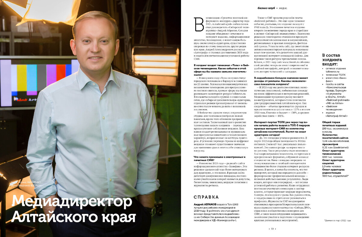 В номинации «Средства массовой информации» конкурса «Директор года 2021. Алтайский край» победителем стал руководитель «Сибирской медиагруппы» Андрей Абрамов. Сегодня холдинг объединяет печатные и интернет-издания, информационное агентство, телевидение, и имеет самую большую ежемесячную аудиторию, существенно опережая по этому показателю другие редакции края. Андрей Александрович рассказал «Автографу» о главных достижениях 2021 года и поделился составляющими успешной работы СМИ.