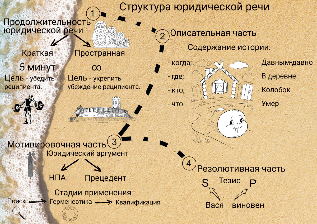 1. Продолжительность юридической речи. 2. Описательная часть (фабула) юридической речи. 3. Мотивировочная часть юридической речи. 4. Резолютивная часть юридической речи. Продолжительность юридической речи В речи юриста должно присутствовать две речи: краткая и пространная. В качественной юридической речи должно быть две речи, которые напоминают матрёшку. Маленькая речь, которая прячется внутри большой речи. Краткая речь, в ходе которой реципиент принципиально принимает сторону юриста. В общей сложности такая речь не должна длиться более пяти минут. Эта речь создаётся по общим канонам убеждающей речи. Цель - убедить реципиента. Пространная речь необходима для того, чтобы юрист предоставил аргументы для того, чтобы реципиент смог обосновать своё решение для других. В ходе пространной речи излагаются подробные аргументы и обоснования решения для иных лиц (судов апелляционной, кассационной инстанции). Цель - укрепить убеждение реципиента. Описательная часть (фабула) юридической речи. Стру