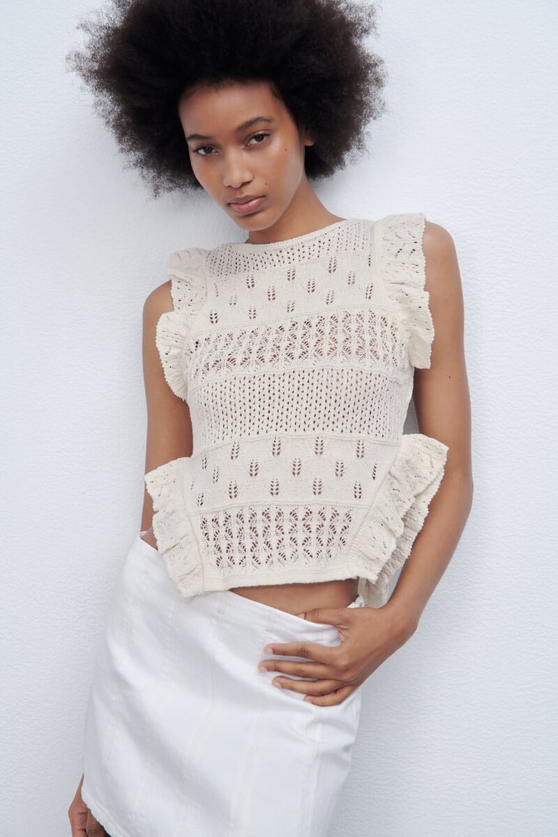 Если Zara не идёт к нам, свяжем Zara сами! Zara всегда удивляет обильным наличием вязаного трикотажа. Летняя коллекция не исключение. Сегодня рассмотрим новинки лета 2022г. Топ с воланами и перфорацией Если бы вязала сама, по бокам нижней части изделия не стала бы вязать воланы. В целом, топ мне очень понравился. Платье из кружева кроше с цветочным узором Довольно смелое платье. На пляж идеальный вариант. Длинное платье из сетчатого трикотажа Тоже довольно откровенное платье, как, собственно, почти вся коллекция Zara. Я бы такое надела на ужин где-нибудь на берегу моря. Укороченный трикотажный топ с перфорацией Этот топ понравился больше всего. Будет стильно смотреться с широкими брюками на высокой талии. Трикотажный топ с воланами на рукавах Классный топ. Но нужно правильно подобрать нижнее белье. Конечно же телесного цвета. Либо, если будете вязать сами, пришить тканевый подклад в области груди. Мини-платье с кружевом кроше Такое платье только на пляж. Кроп-топ из кружева кроше Т