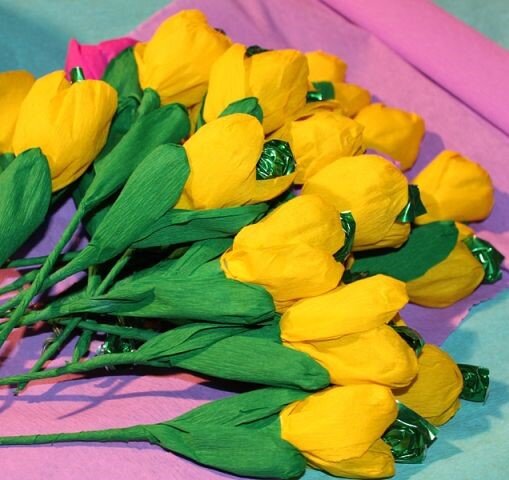 Однажды перебирая кладовку, наткнулась на кипу гофрированной бумаги, залежи еще наверное с моего детсадовского возраста... просто выкинуть рука не поднялась. Крутила, вертела, листала интернет и в конце-концов нашла применение... как раз наносу было 8 марта. Просто по конфетке вручить - не серьезно, а тюльпанчик с конфеткой для девочек из дет. садовской группы и одноклассниц сыновей- вполне. для "дорогих сердцу" девочек розочки учителям и воспитателям по букетику в общем получилось не плохо и бюджетно... и гофрированная бумага ушла в дело...