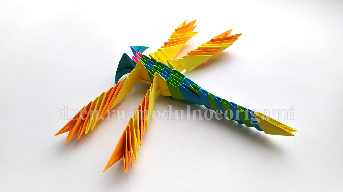 Здравствуйте, друзья! На прошлом занятии я показал начинающим оригамистам, как собрать симпатичную рыбку. На этом занятии мы с вами соберем не менее симпатичную стрекозу. Список мастер классов. Кто забыл, как собирать треугольные модули, переходим сюда. Для стрекозы нам понадобится 64 модуля: 21 желтый, 13 зеленых, 16 оранжевых, 12 голубых и 2 розовых. Цвета для вашей стрекозы можете выбрать свои. Начнем с тельца стрекозы. Первый ряд из 2 розовых модулей соединяем со вторым рядом из 3 зеленых модулей. Зеленые модули крепим наружными модулями. Третий ряд состоит из 2 голубых модулей. В четвертом ряду крепим 3 зеленых модуля. Наружные кармашки крайних модулей надеваем на уголки второго ряда. В пятом ряду крепим 2 голубых модуля. В шестом ряду крепим 3 зеленых модуля аналогично четвертому ряду. Седьмой ряд состоит из 2 голубых модулей. Крайними кармашками захватываем по 2 уголка шестого ряда. В восьмом ряду крепим 1 зеленый модуль. В девятом ряду крепим 1 голубой модуль. Каждым кармашком