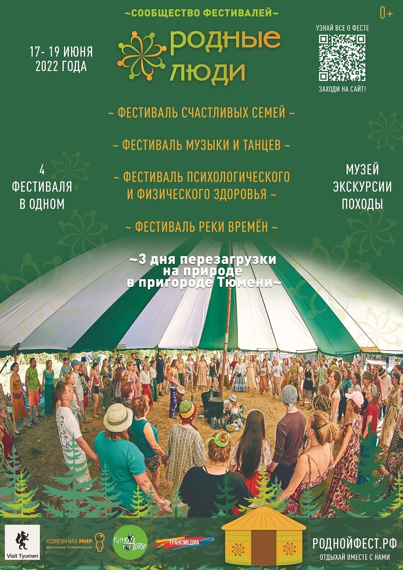 С 17 по 19 июня 2022 года недалеко от Тюмени пройдет новый семейный этнофестиваль под названием «Родные люди». Местом проведения станет экопоселение «Родное», которое находится на 52 км от Тюмени по Ирбитскому тракту, между деревнями Речкина и Бурмакина. Создатели фестиваля «Родные люди» Елена и Дмитрий Силины cо своей старой командой долгое время являлись соорганизаторами этнофестиваля «Небо и Земля». Их новый проект ориентирован, прежде всего, на активный семейный отдых в условиях экологически чистого соснового леса. Благодаря уникальной атмосфере и природе экопоселения «Родное» гости фестиваля смогут перезагрузиться и уйти от рутины в атмосфере праздника, найти близких по духу новых друзей, получить новые знания от экспертов фестиваля и почувствовать себя жителем минувших эпох благодаря музею под открытым небом. По задумке организаторов Фестиваль «Родные люди» будет включать в себя 4 отдельные фестивальные площадки: фестиваль счастливых семей, фестиваль музыки и танца, фестиваль муз