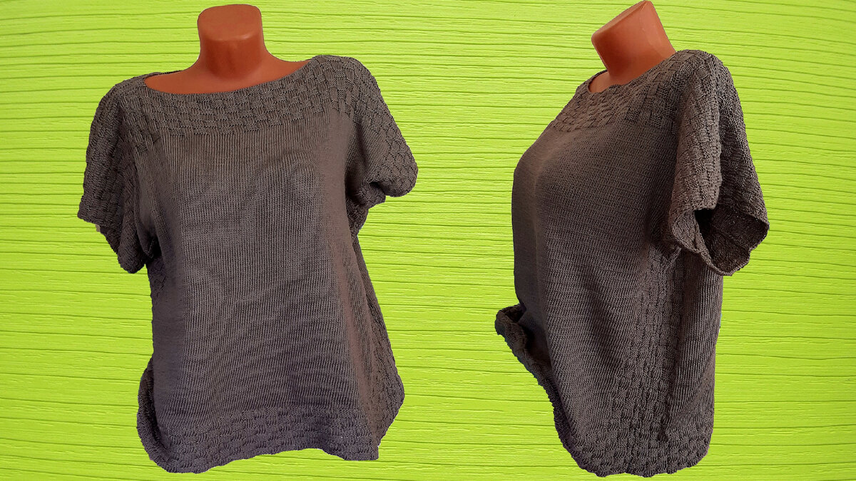 Предлагаю вашему вниманию летний топ свободного кроя с отделкой узором плетенка из хлопковой пряжи . Такой свободный хлопковый топ будет очень удобен в летние жаркие дни и скроет все недостатки фигуры. Ширина топа по боковым швам 60 см, длинна 61 см, ширина от края рукава до края рукава 77 см, горловина 28 см. Этот топ связан из пряжи АННА 16 (530 м на 100гр) в две нити спицами №3. Вам понадобиться 500гр пряжи. Последовательность вязания. Передняя часть топа. Набираем на спицы 172 петли. вяжем узором "Плетенка" 3 раппорта (36 рядов) Схема узора "Плетёнка" Посмотреть как вяжется этот узор можно в видео. Дальше вяжем лицевой гладью, продолжая вязать по бокам детали полтора раппорта (15 петель) узором. Связав 156 рядов (13 раппортов узора), снимаем 16 петель с каждой стороны на петлесъёмные булавки. На данном этапе вязания топа эти петли участвовать в вязании не будут. Далее делаем расширение полотна в две стороны в одном ряду на 36 петель в каждую сторону. Вяжем переднюю часть топа