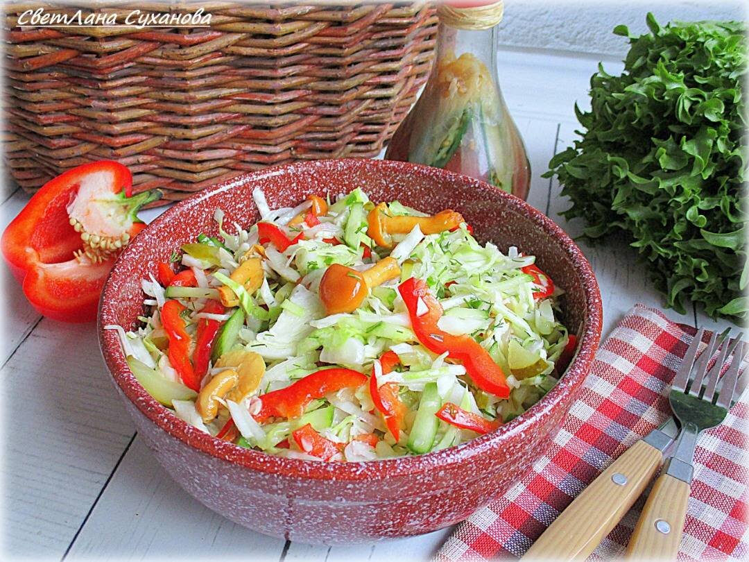#меню Этот салат всегда идет на ура хоть за будничным столом, хоть за праздничным. Если любите капустные салаты, рекомендую приготовить. Ингредиенты: Капуста белокочанная, огурец свежий , огурец маринованный , перец сладкий красный , опята маринованные, лук салатный (красный или белый) , чеснок , масло подсолнечное рафинированное, соль, сахар, перец черный, сок лимона (или винный уксус) Способ приготовления: Капусту нашинковать. Не мять! Лук нарезать полукольцами, свежий и маринованный огурцы - соломкой. Добавить их к капусте. Положить в салат нарезанный тонкой соломкой болгарский перец и опята, мелко нарубленный чеснок. Добавить сахар, соль, сок лимона или уксус, перемешать. Раскалить растительное масло, вылить масло на салат и снова перемешать. Пр желании посыпать салат зеленью и перцем. Дать салату настояться минимум три часа, а лучше пять, чтобы овощи хорошо промариновались.