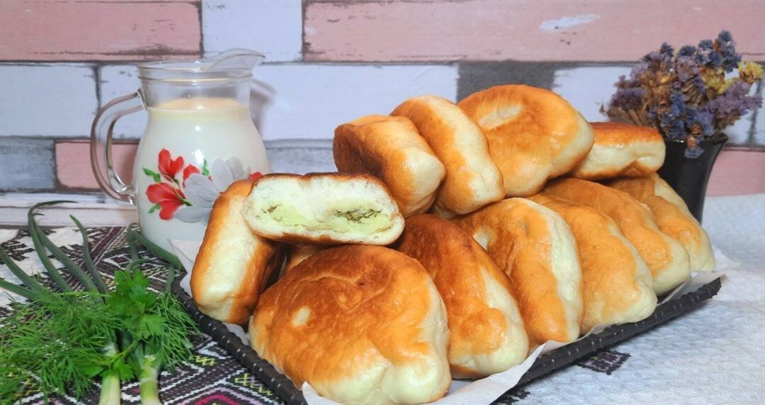 М’яке тісто яке довго не черствіє Ингредиенты: борошна, теплої води, окропу, сухих швидкодійних дріжджів, цукру, солі, олії, Рослинна олія для смаження, Начинка:, Картопля, Кріп, Вершкове масло, сіль Способ приготовления: Спочатку приготуємо начинку: очищаємо картоплю, ріжемо її на дрібні шматочки, заливаємо водою і ставимо варити до готовності. Далі зливаємо воду, додаємо до картоплі вершкове масло та сіль. Робимо топтанку, додаємо нарізаний дрібно кріп, перемішуємо, накриваємо і залишаємо до повного охолодження. Готуємо тісто, в місткість виливаємо теплу воду, висипаємо цукор, сіль. Окремо в мисці просіюємо борошно, до нього додаємо дріжджі, перемішуємо. Додаємо борошно до теплої води перемішуємо поки борошно не вбере вологу, потім додаємо окріп, і тепер добре замішуємо, під час замісу додаємо олію, і вимішуємо до моменту коли тісто буде еластичне, м’яке і не липне до рук (10-15 хвилин). Тісто використовують відразу, ділимо на частини приблизно 50-60 гр, потім качалкою розкочуємо кол