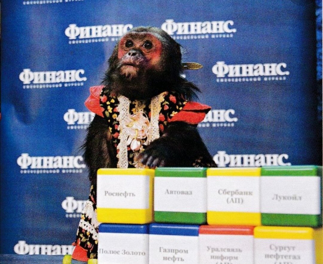 В декабре 2008 года журналисты издания "Финанс" провели шуточный эксперимент, решив проверить, что на самом деле выгоднее на длительной инвестиционной дистанции — собрать случайный портфель из акций российских компаний или купить паи крупнейших паевых инвестиционных фондов. Пригласили журналистов, управляющих фондами и... обезьяну.