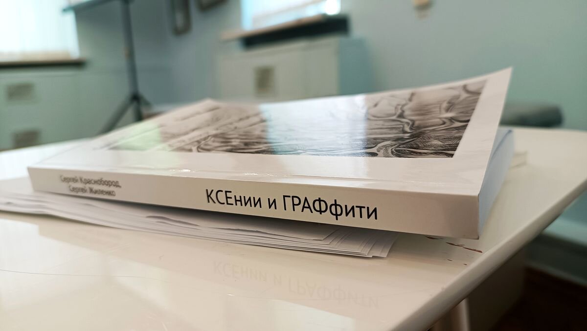 Выход книги «КСЕнии и ГРАФфити» коллег по журналистскому цеху Сергея Красноборода и Сергея Жиленко – событие в культурной жизни города, мимо которого просто нельзя пройти. У тех, кто интересуется местным творчеством, эти имена на слуху. Сергей Краснобород работает на областной радиостанции «Гомель Плюс», с 1982 года публикуется в литературных журналах, выпустил несколько книг стихов и прозы. Сергей Жиленко – оператор Первого городского телеканала, а в свободное от работы время – художник, рисует в графическом стиле больше 30 лет. За это время были и персональные выставки в Гомеле, и участие в коллективных экспозициях. Слева – направо: Сергей Жиленко, Сергей Краснобород, Елена Лагунова. Новая книга, которую презентовали в картинной галерее Г.Ващенко, результат многолетнего творчества двух талантливых гомельчан. Но создавали произведения авторы отдельно друг от друга, идея объединить их под одной обложкой пришла спонтанно. – Как-то Сергей Евгеньевич приходит ко мне и говорит,