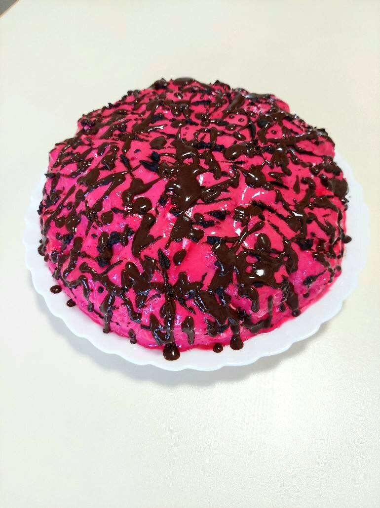 #непп #торт #панчо Ингредиенты: Бисквит:, яйца, сахар, мука, Ванилин, Разрыхлитель теста, Начинка:, Ананас консервированный + сок ананаса, Зефир клубничный, ванильный, Крем:, сметана 20%, сгущёнки молоко, Краситель пищевой красный, Глазурь:, шоколад черный, масло сливочное, молоко Способ приготовления: Бисквит выпекаем привычным для вас способом. Я беру свой рецепт, ингредиенты в описании. Готовый Бисквит разрешаю вдоль на 2 коржа. Один корж беру за основу, второй нарезать кубиками. Приготовить крем, смешать сметану и сгущенное молоко ч пропорции 1:1. На блюдо кладём 1 корж, пропитываем его ананасовым соком с банки от консервированных ананасов, смазываем кремом. Выкладываем кусочки ананасов. Затем слой зефира, каждую зефирку разделить вдоль, для тонкого слоя. Затем кубики бисквита, каждый, обмакиваем в крем и выкладываем по верх зефира, формируем форму полушара. В оставшийся крем добавить пищевой краситель красного цвета, перемешать и полить весь торт. Приготовить глазурь, растопить на